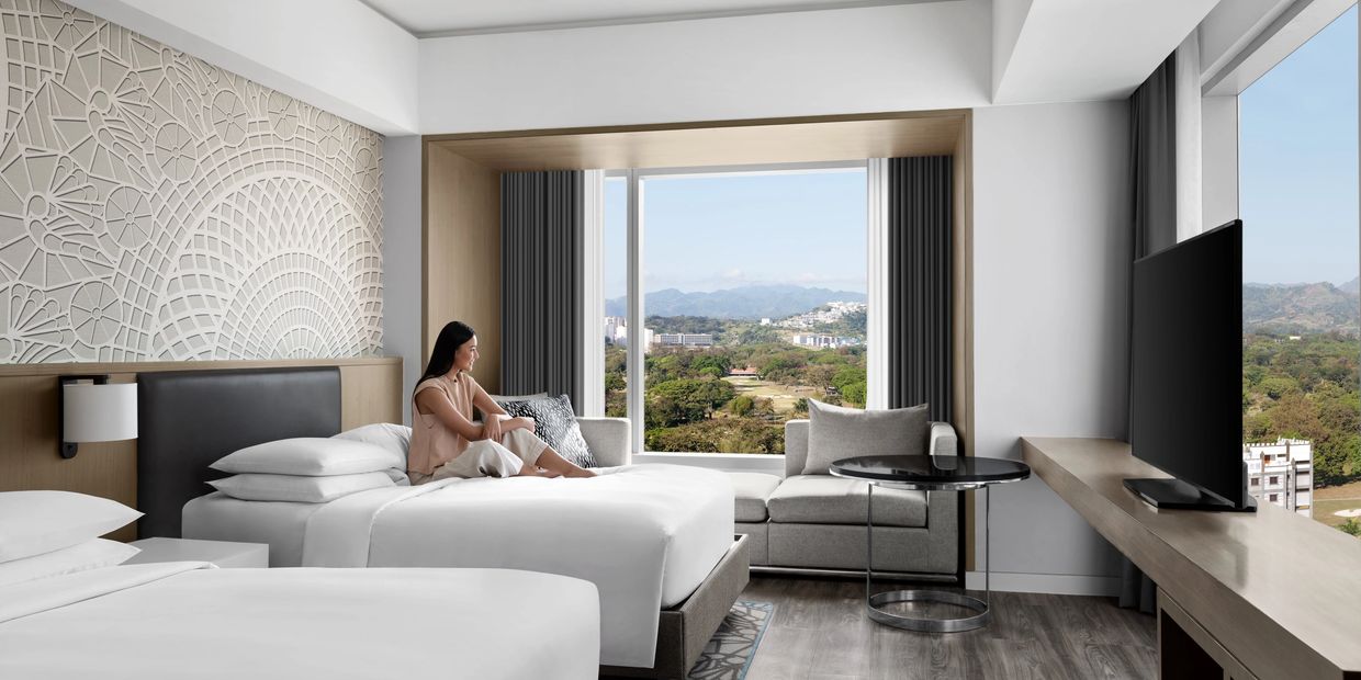 You stretch and make your way to the floor-to-ceiling windows. As you draw back the drapes, a breathtaking panorama unfolds—the majestic Zambales Mountain Range, stretching across Zambales, Bataan, and Pampanga. The peaks roll across the horizon in deep shades of green, and even from behind the glass, you can feel the crisp morning air.
